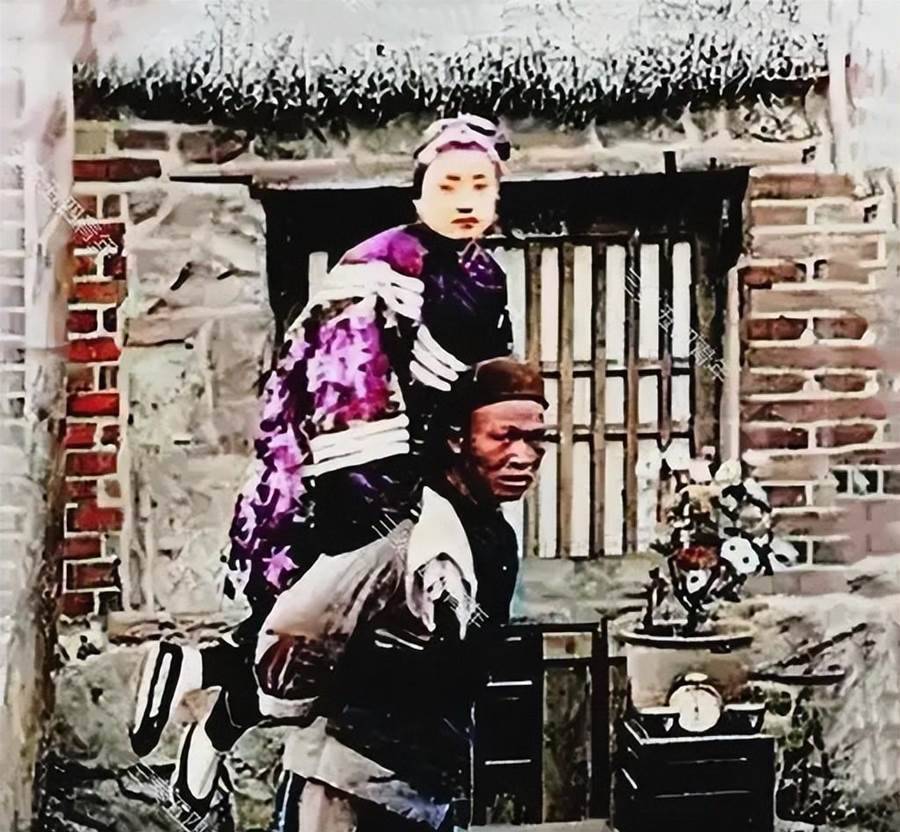 這是女子結婚時,男人的哥哥背著女子上轎的場景!上世紀六、七十年代,曾經見過男人背女人過河,女人卷起來雙腿,男人反手扳住女人腳踝處。