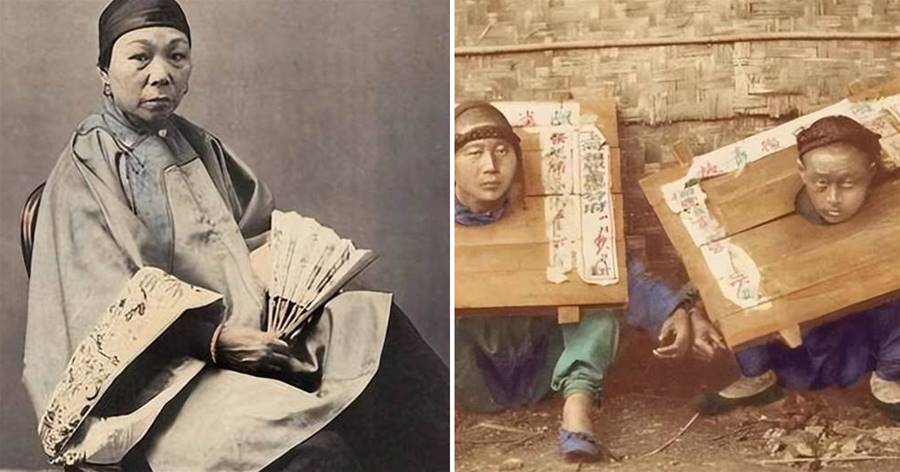 這是晚清時期的犯人,可以看到他們戴著枷鎖,手還綁在了一起。