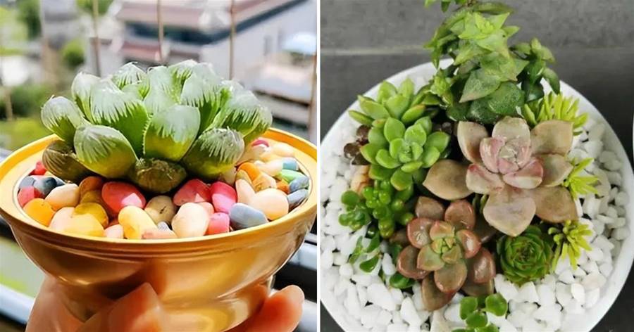 石子的白色與碗相得益彰,更能襯托出多肉葉片上的色彩,頗具美感。