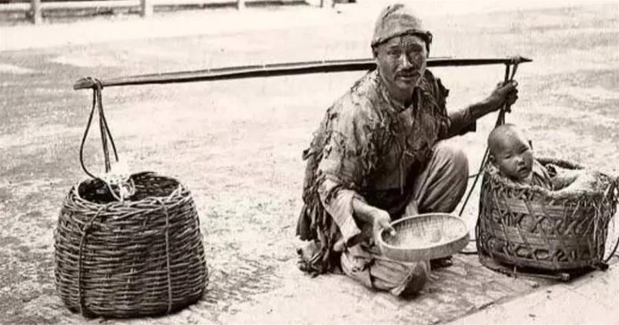 一起逃荒的父子,這一幕總是讓人心生憐憫。幾歲的孩子坐在父親的籮筐里,可憐巴巴地對著鏡頭。清末世道艱難,很多人成了乞丐,背井離鄉去討飯。實際上災荒連年之下,哪都一個樣。
